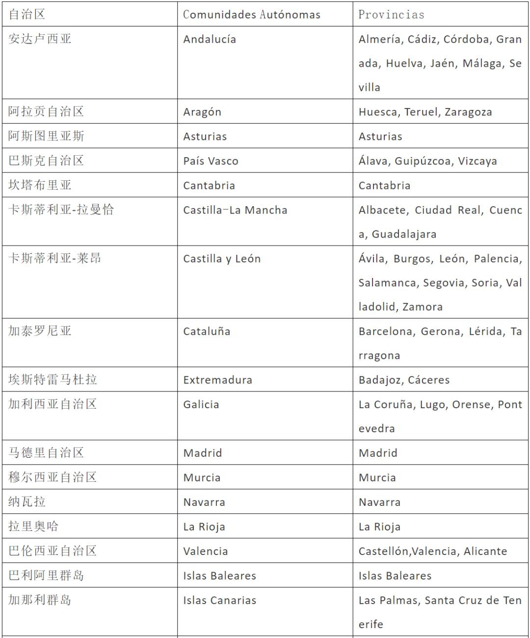根据宪法,西班牙由中央政府、自治区和地方政府(包括省、岛屿、市和村镇等)三级政权组成,共有17个自治区,下设50个省、8100多个市镇。