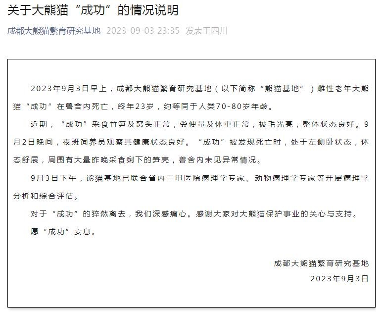 2023年9月3日早上,成都大熊猫繁育研究基地(以下简称“熊猫基地”)雌性老年大熊猫“成功”在兽舍内死亡,终年23岁,约等同于人类70-80岁年龄。