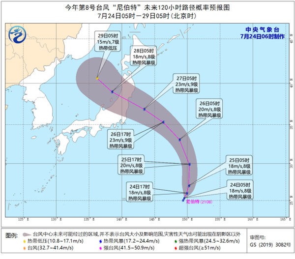 预计,“尼伯特”将以每小时10公里左右的速度向北偏东方向移动,强度逐渐加强,最强可达热带风暴级或强热带风暴级(23-25米/秒,9-10级);26日开始“尼伯特”转向西北方向移动,逐渐向日本东部沿海靠近,并于27日前后在日本东部沿海登陆。