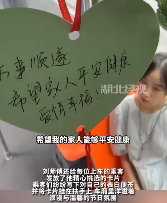 刘师傅还给每位上车的乘客发放了他精心挑选的卡片,乘客们纷纷写下对自己的表白便签,并将卡片挂在扶手上,车厢里洋溢着浪漫与温馨的节日氛围,今天的武汉703路公交齁甜。