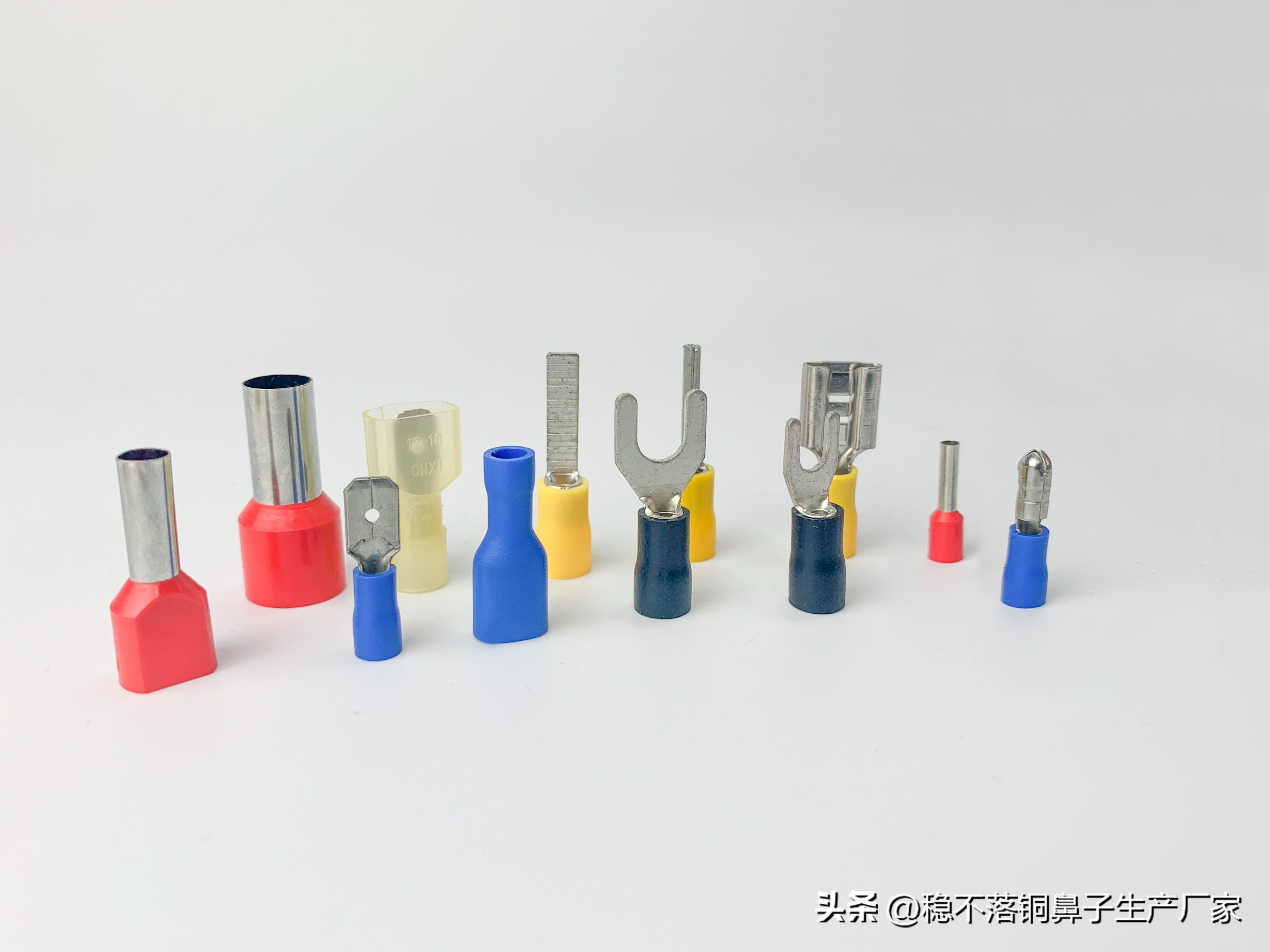 铜线鼻子除型号比较多外,不同的规格在外观上也有区别,常见的有叉形端子、圆型端子、管型端子、片形端子、针型端子、铜铝过渡接线鼻子、DT铜鼻子、SC窥口铜鼻子、OT开口线鼻子、JG船用铜鼻子等。这些不同外观的铜鼻子适合的行业也不一样,大家在选择前要确认情况外观形状。