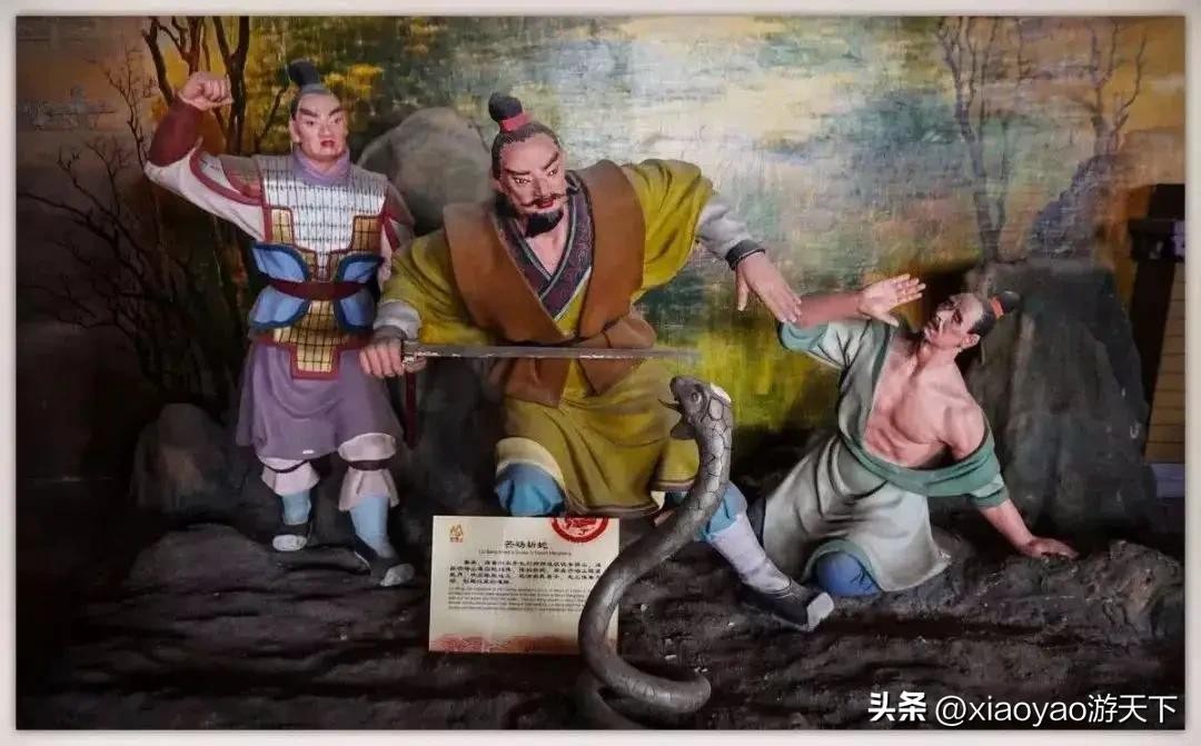 两千二百多年前的一天,身为泗水亭长的刘邦押送着一批刑徒到骊山修建秦始皇陵。为了活命,这批刑徒在路上很多都逃走了,走到丰邑西芒砀山中的一片水泽时,喜欢喝酒的刘邦停下来饮酒,并且将这批刑徒全部放走。到了晚上,宿醉的刘邦来到水泽边,看到有一条蟒蛇挡道,于是拔剑斩杀了这条蟒蛇。这就是刘邦斩蛇起义的故事,被司马迁记载到了《史记﹒高祖本纪》中。