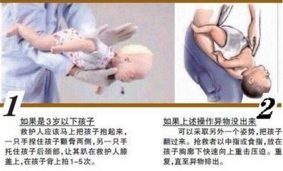 小孩子出现噎食现象,如果能看到异物,可以将手指伸入喉咙中,直接取出,也可以用手指压迫舌根,产生呕吐反射,将异物呕出。如果这种方法无效,可以尝试“海姆里克”急救法:用手托住小孩子腹部,头放低,用手拍打孩子背部;如果小孩子比较重,可以用膝盖顶住孩子腹部,再把头的位置放低,进行拍打抢救。异物排出后,如果小孩子仍然没有呼吸,应该施行口对口人工呼吸,直到小孩子可以自行呼吸。
