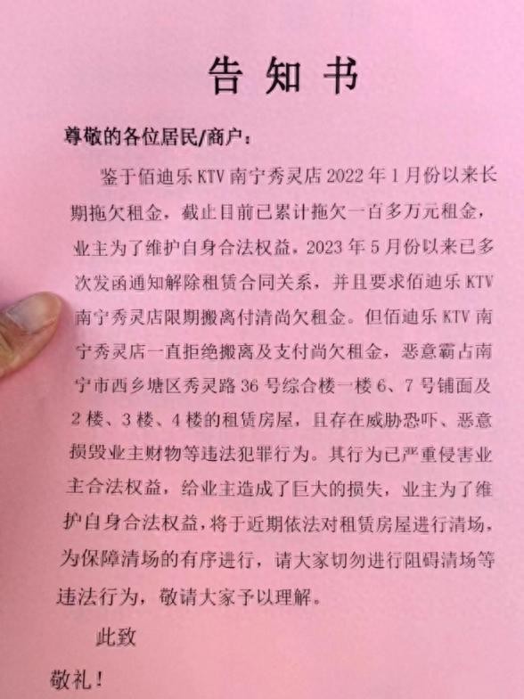 根据一份提前发给附近居民商户的告知书可以看到,业主称佰迪乐KTV南宁秀灵店已拖欠一百多万元租金,因一直以来佰迪乐KTV拒绝搬离和付清租金,并存在恐吓威胁、恶意损毁业主财务等违法行为。