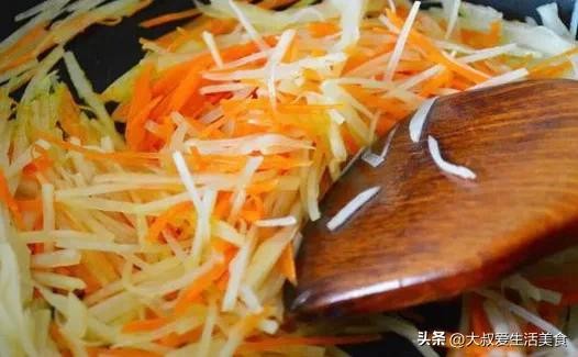 3、起锅烧油,油温起来,倒入葱蒜,炒香,然后倒入土豆丝胡萝卜丝,翻炒几下,加入香醋,盐,生抽,鸡精,十三香,蚝油,翻炒均匀,