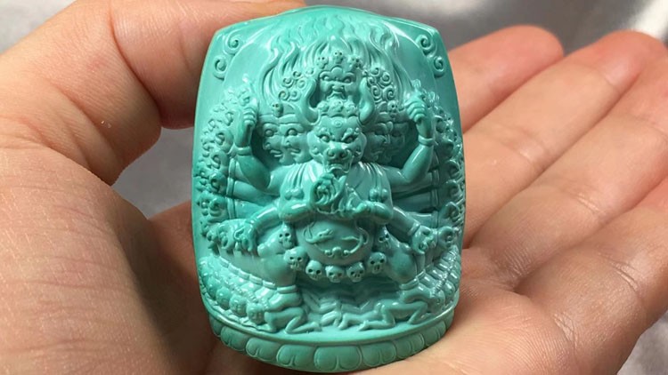 在绿松石大威德金刚的雕刻中二臂四臂和十八臂比较常见,如绿松石千手观音一样,不仅要生动的体现出人物特性,还要在面部居中,手足分布协调等方面下足功夫