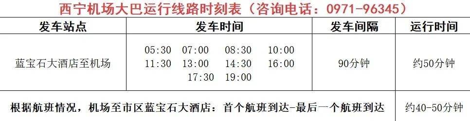 自12月10日起,西宁机场巴士从市区(蓝宝石大酒店)至机场发车时间有所调整,调整后的发车时间为05:30至19:00,每90分钟一班。