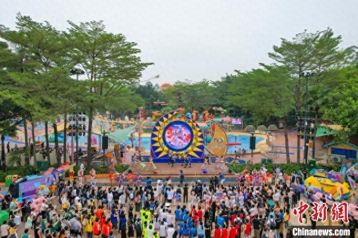 4月26日,经升级改造后的广州长隆水上乐园正式开园迎客。目前,该乐园有磁力炮水上过山车、风暴双响炮、冲天双浪板、水上超级电音派对等70多个水上游乐项目供游客体验游玩。图为游客观看开园表演。(无人机照片)中新社记者 陈骥旻 摄