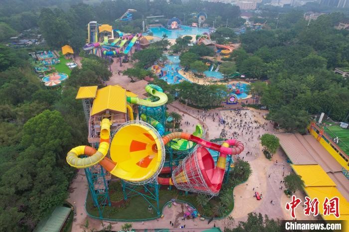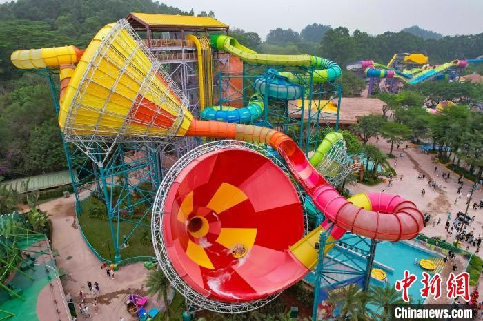 4月26日,经升级改造后的广州长隆水上乐园正式开园迎客。目前,该乐园有磁力炮水上过山车、风暴双响炮、冲天双浪板、水上超级电音派对等70多个水上游乐项目供游客体验游玩。(无人机照片)中新社记者 陈骥旻 摄