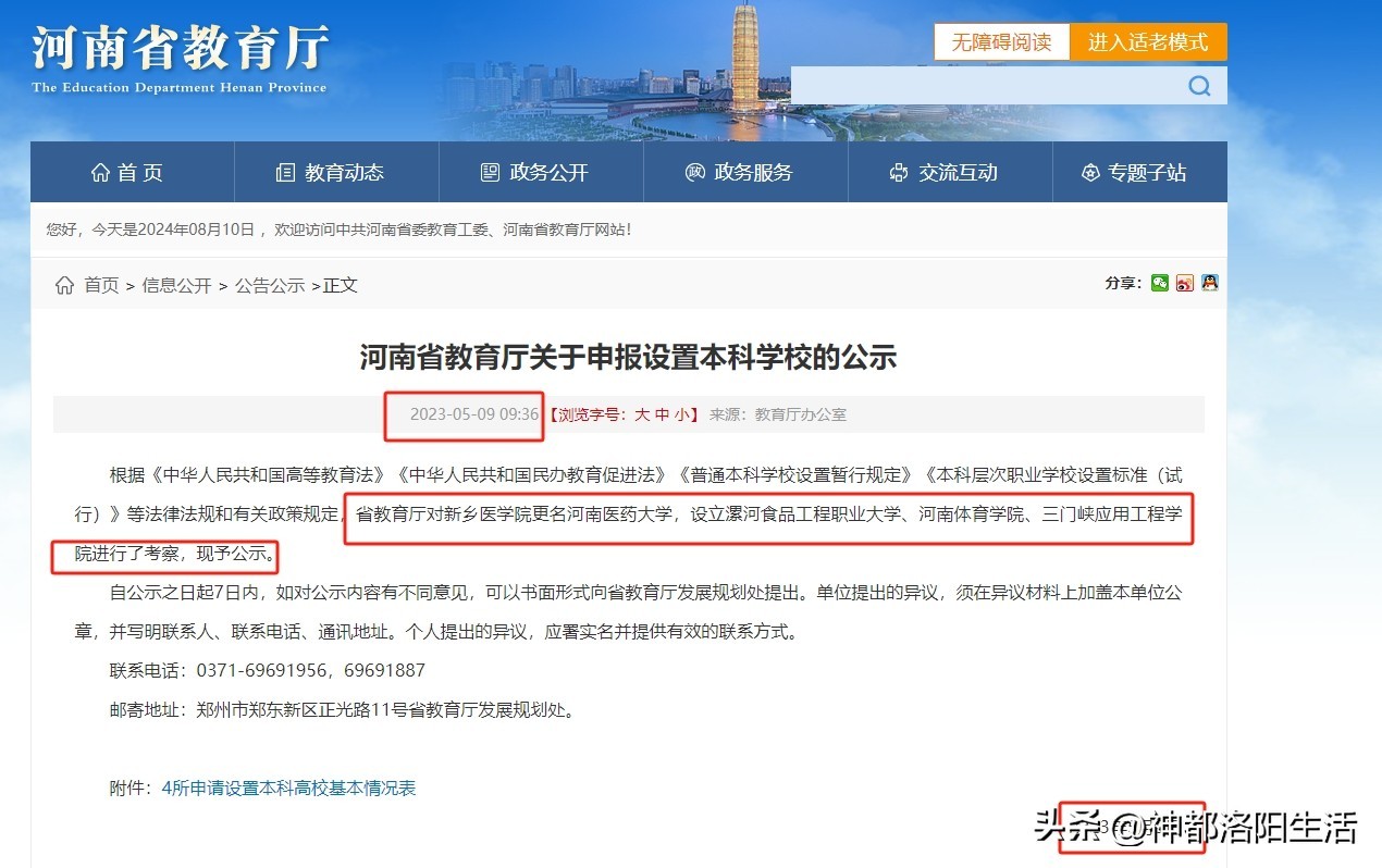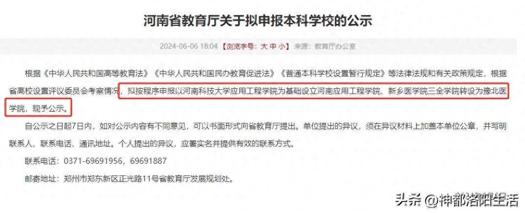 2024年6月6日,河南省教育厅,公布了4所关于拟申报本科学校的公示,其中就写到“拟按程序申报以河南科技大学应用工程学院为基础设立河南应用工程学院、新乡医学院三全学院转设为豫北医学院,现予公示。”
