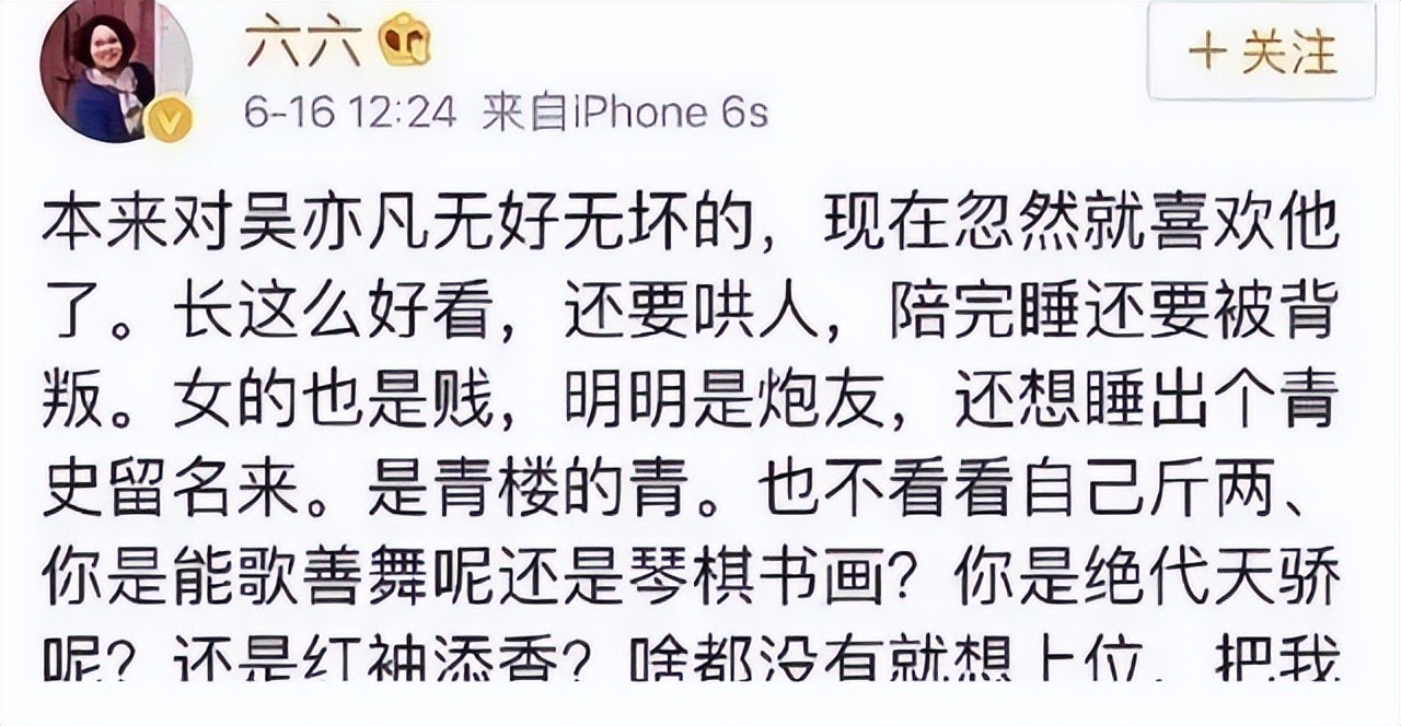 在2016年,网红小G娜就曝光了一张和吴亦凡的亲密照,编剧六六、时尚杂志主编苏芒、《奇葩说》辩手马薇薇出来支持了我们家凡凡。其中这个六六发言最离谱!