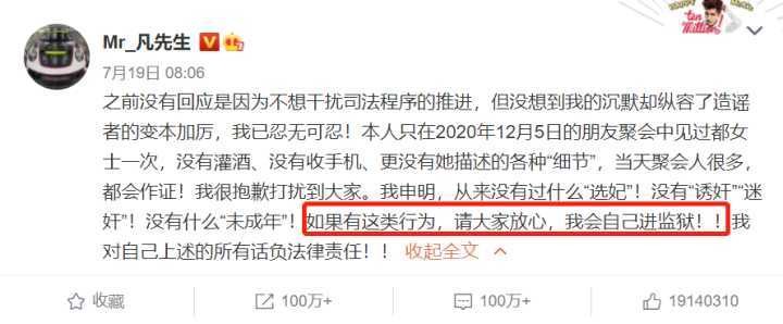 话说到此突然有点明白,部分疯狂粉丝的想法,假如凡凡“宠幸”的是她们,她们可能真的不会报警。一个是对我们家凡凡的感情难割难舍舍不得我家凡凡去坐牢,另一个是举证难那就还能当做是爱情的骗子认栽了。比如小G娜。