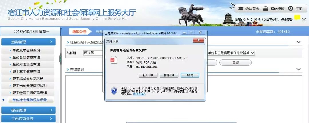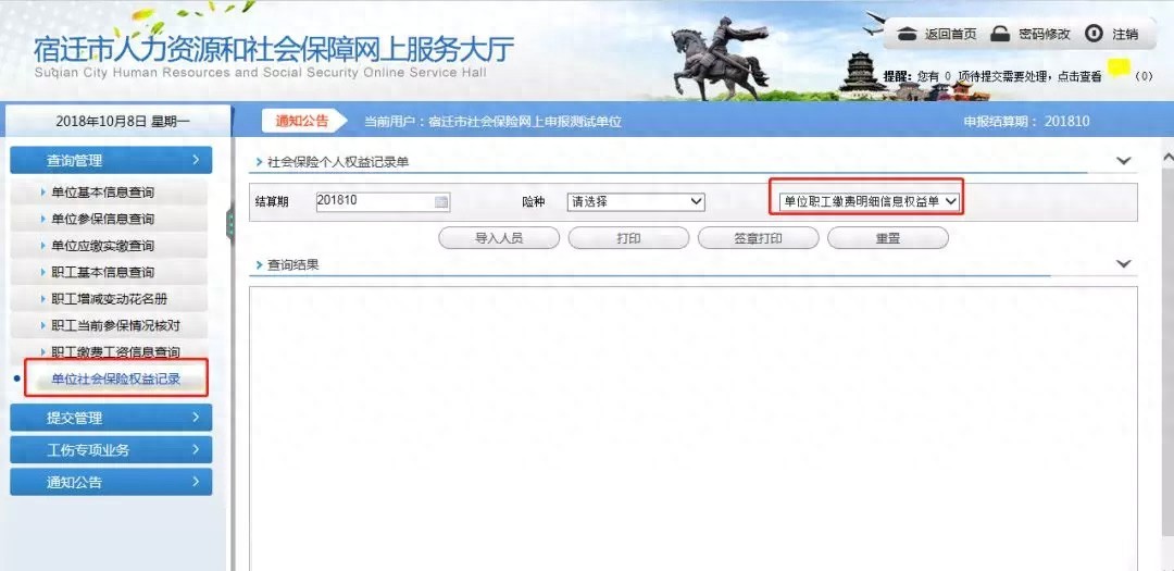 二、点击“查询管理”--单位社会保险权益记录。选择要打印的结算期和证明。