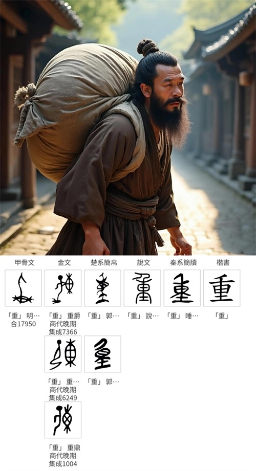 其字源意义有多种解释。从字形上看,金文的“重”字,像一个人背负着重重的行囊,寓意着分量大、沉重。行囊里或许装载着生活的物资,又或许是远行的希望。
