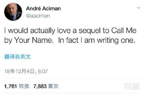 最近,《请以你的名字呼唤我》原小说作者安德烈·艾席蒙发布了一条续集,他表示自己目前正在创作续集,也就是说这部电影一定会有续集,只不过不知道作者什么时候能完成续集的创作。
