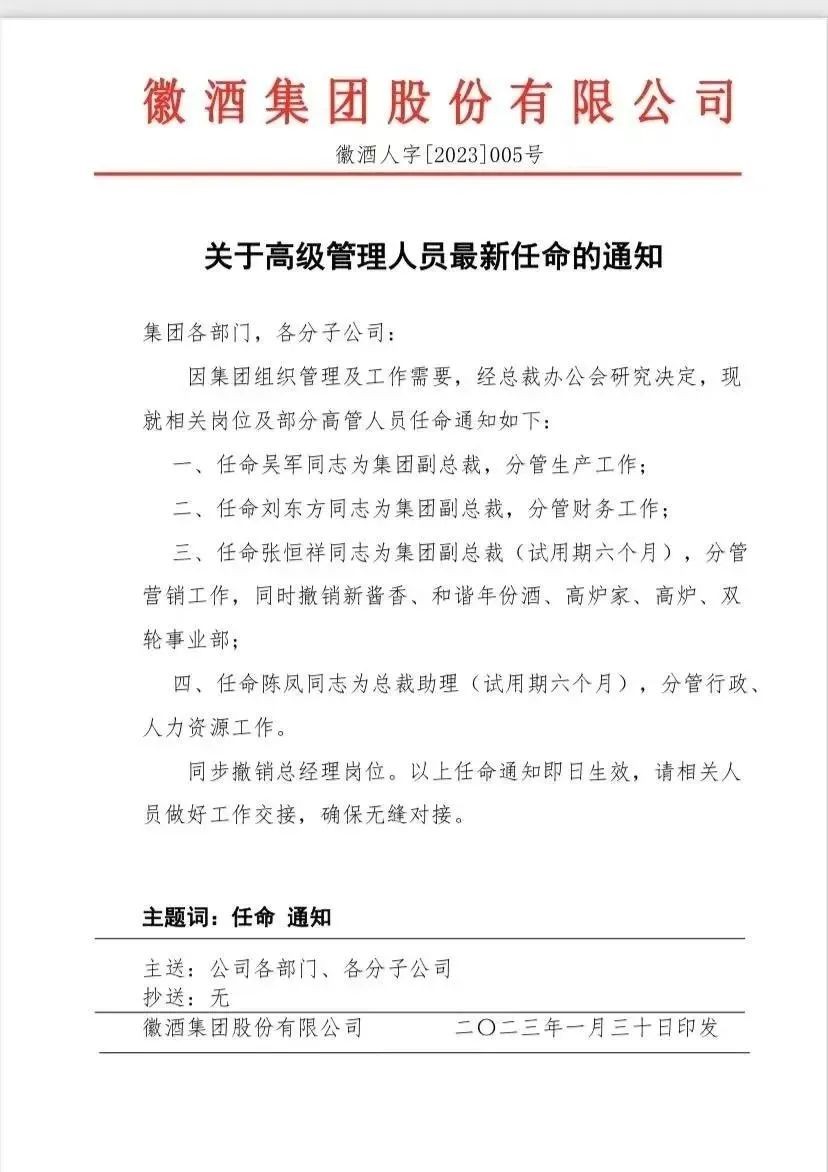 最新的一例发生在刚刚过去的1月30日。当天,徽酒集团发布《关于高级管理人员最新任命的通知》,宣布撤销总经理岗位,分别任命吴军、刘东方、张恒祥为集团副总裁,并分别分管生产、财务和营销工作,任命陈凤为总裁助理,分管行政和人力资源工作。
