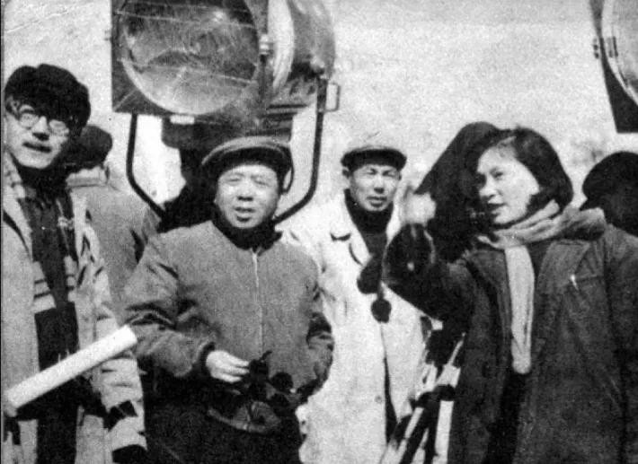 导演成荫(左2)与秦怡等人在《浪涛滚滚》拍摄现场