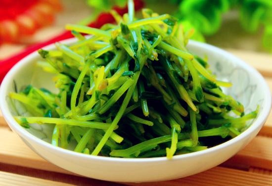 1. 将豌豆尖焯水至变色,捞出沥干备用。