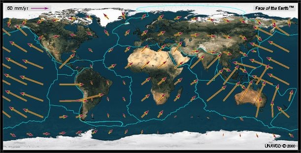 相信大部分人都能看懂,图中箭头的方向是板块运动的方向,箭头的长度表示运动的速度。