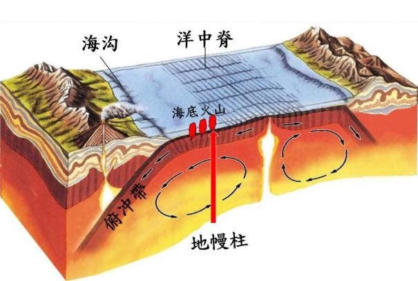 郝斯认为大洋中脊是地幔对流上升的地方,地幔物质不断从这里涌出,太平洋周围分布岛屿与海沟、大陆边缘山脉以及火山、地震就是这样形成。