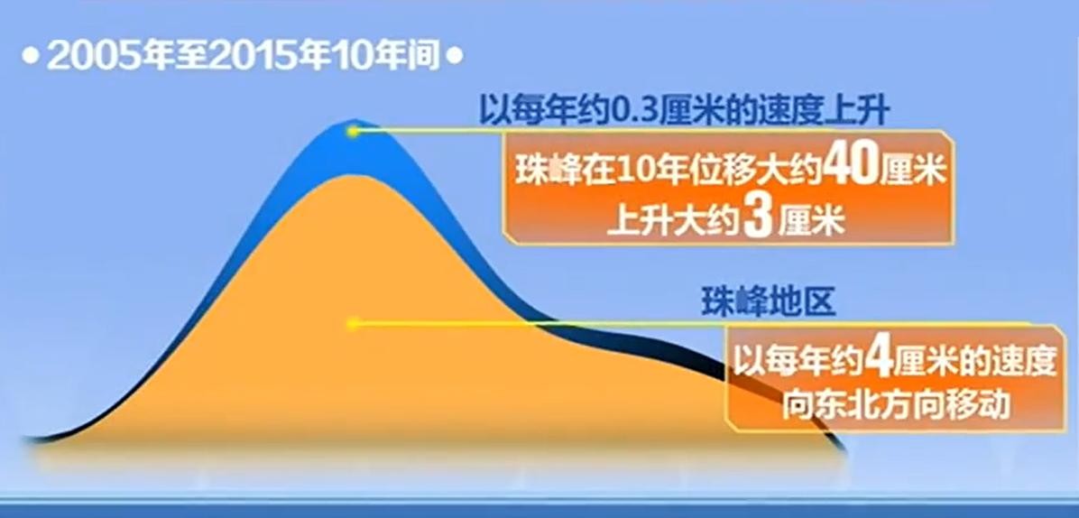 除此之外,有资料显示在2005年到2015年的10年间,珠峰地区以每年约为4厘米的速度向东北方向移动,并且以每年0.3厘米的速度上升。在这10年里,珠峰大约位移了40厘米,上升了大约3厘米。