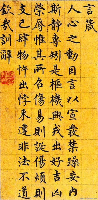 言箴:人心之动,因言以宣,发禁躁妄,内斯静专,矧是枢机,兴戎出好,吉凶荣辱,惟其所召,伤易则诞,伤烦则支,己肆物忤,出悖来违,非法不道,钦哉训辞。