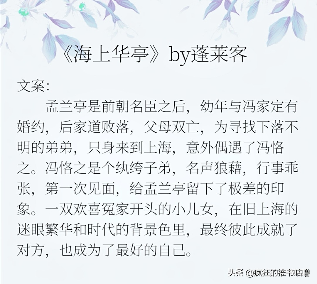 ❤️:蓬莱客的文都挺好看的,这本是民国文,有一丢丢的强取豪夺,前面男主有些小纨绔,喜欢欺负女主,两人都不喜欢对方,后面喜欢上了,会发现男主很专一而且粘人~