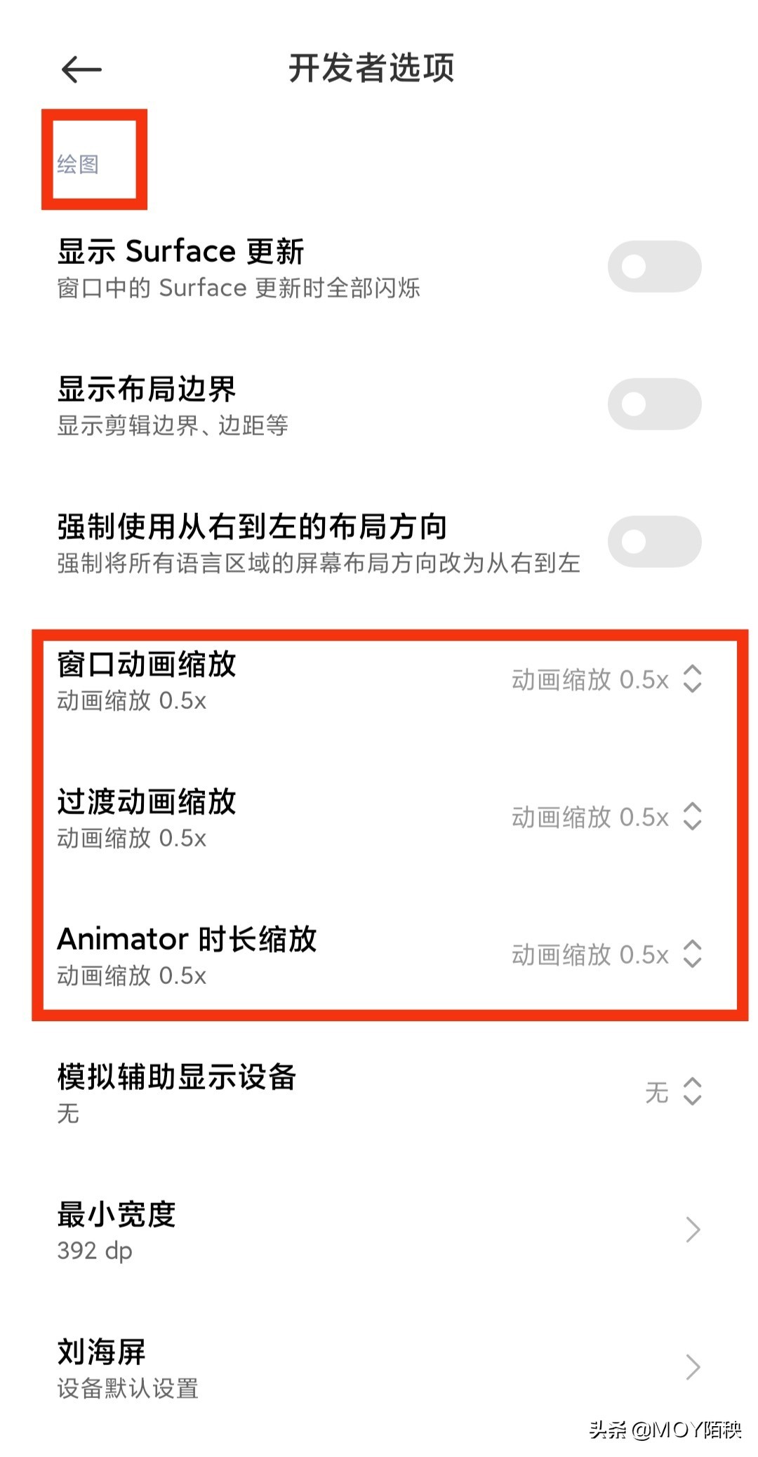 3. 在「开发者选项」设置界面向下滑动找到「绘图」的设置项,将「窗口动画缩放」、「过渡动画缩放」、「Animator 时长缩放」都设置成「动画缩放0.5x」。