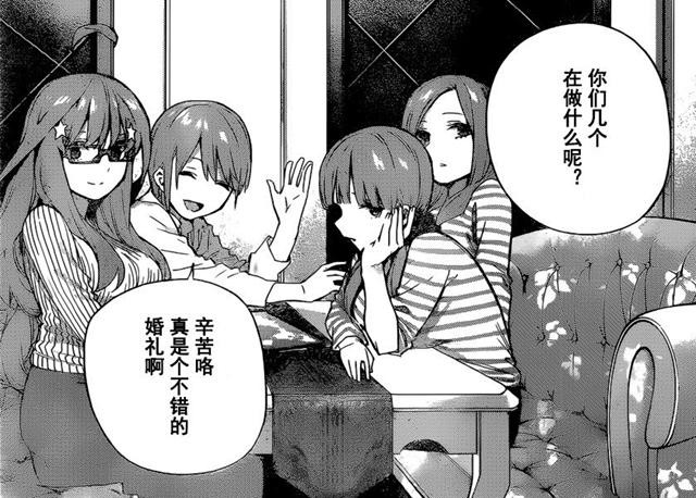 风太郎和四叶的婚礼顺利的进行,双方的家长也都到场了,还有一些好友、同学(没太仔细看)。虽然祝福着两位新人,但四姐妹看到旁边的人却不是自己,估计心里也很不好受。