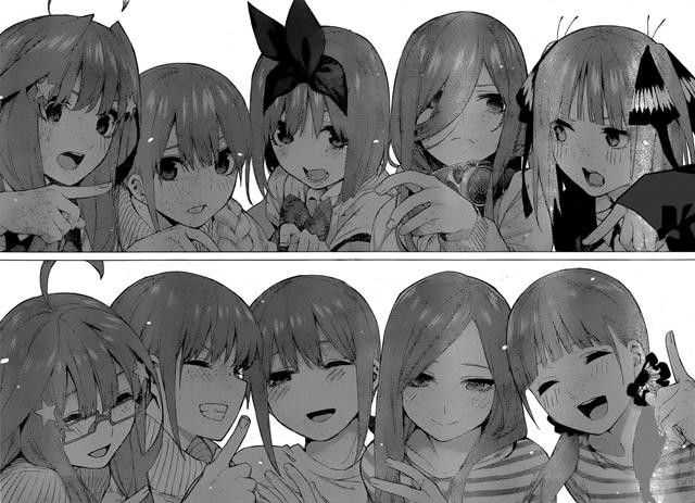 一花、二乃、三玖、四叶、五月五姐妹是都喜欢风太郎的,前三位为此争斗过,四叶是一直喜欢憋在心里,而五月则是四叶和风太郎交往后,才察觉自己的内心。至于风太郎,在最后的学园祭时,曾经对五胞胎说过“我喜欢你们五人”。
