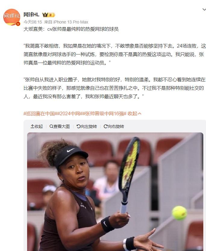 在这场8强赛之前,日本一姐大阪直美就盛赞了张帅——她是最纯粹热爱网球的选手,我简直不敢相信她在如此逆境下还能坚持下去,要知道她一度遭遇24连败啊,这对于网球选手来说是一种试炼煎熬,这就是在检验你是否真的热爱网球。自从我进入职业圈子,张帅就对我很好很温柔。