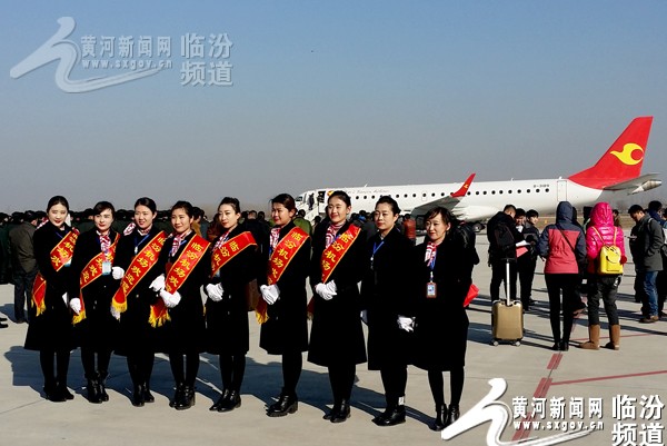 临汾机场地勤人员在首航当天合影留念