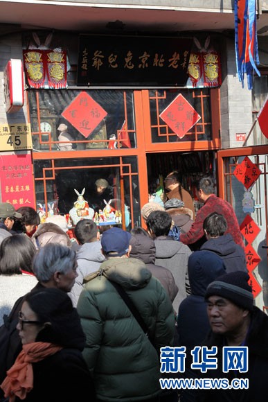 游客簇拥在老北京兔儿爷店铺前 (新华网记者 杨昱摄)