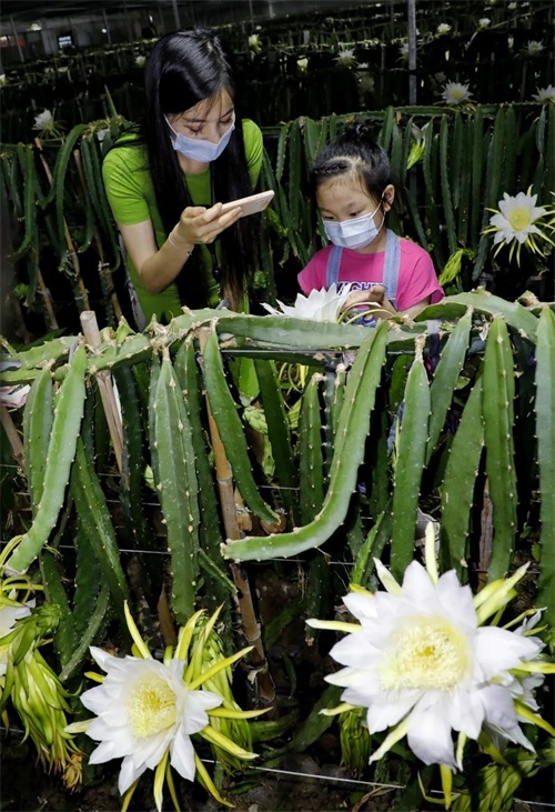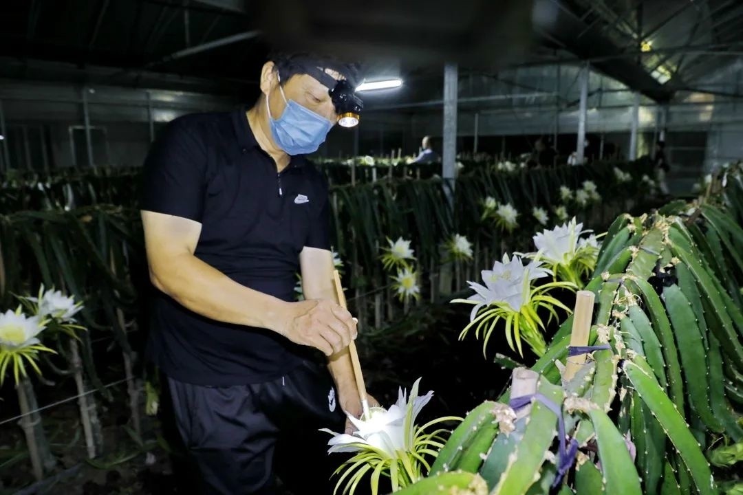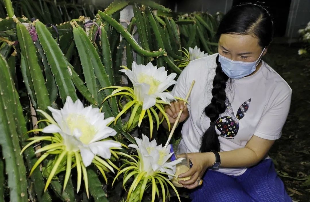 火龙果花又被称为“夜仙子”,只在夜间绽放,花期只有短短几个小时,等待天亮硕大的花苞就会收拢。在这短短的几个小时里,工人们还要抓紧时间对所有的花朵进行人工异株授粉,保证火龙果后期的生长结果。