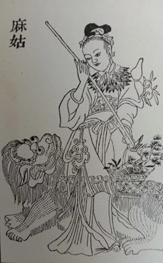 《神仙传》里说,有个东海人叫王方平,当过官,精通天文历法,以后弃官入山修道,成了仙人。王方平有个妹妹叫麻姑,是个漂亮姑娘,年岁十八九,穿着绣花衣服,光耀夺目。她的本事有惊人之处:一是能穿着木屐在水面上行走,可与达摩祖师脚踩芦叶渡海相媲美;二是能掷米成丹砂。