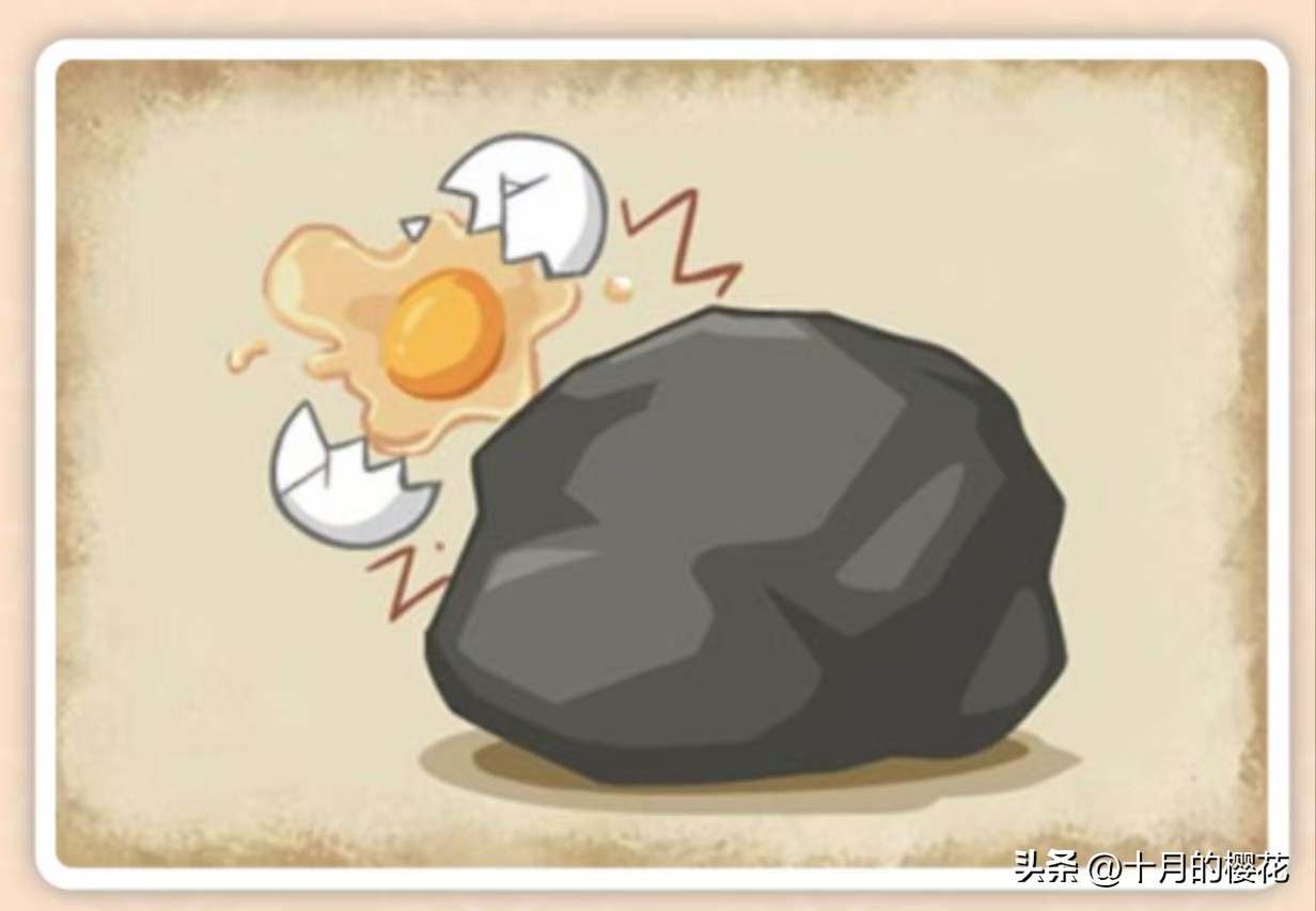 【图 意】:一个鸡蛋敲打在石头上,鸡蛋支离破碎,石头完好无损。