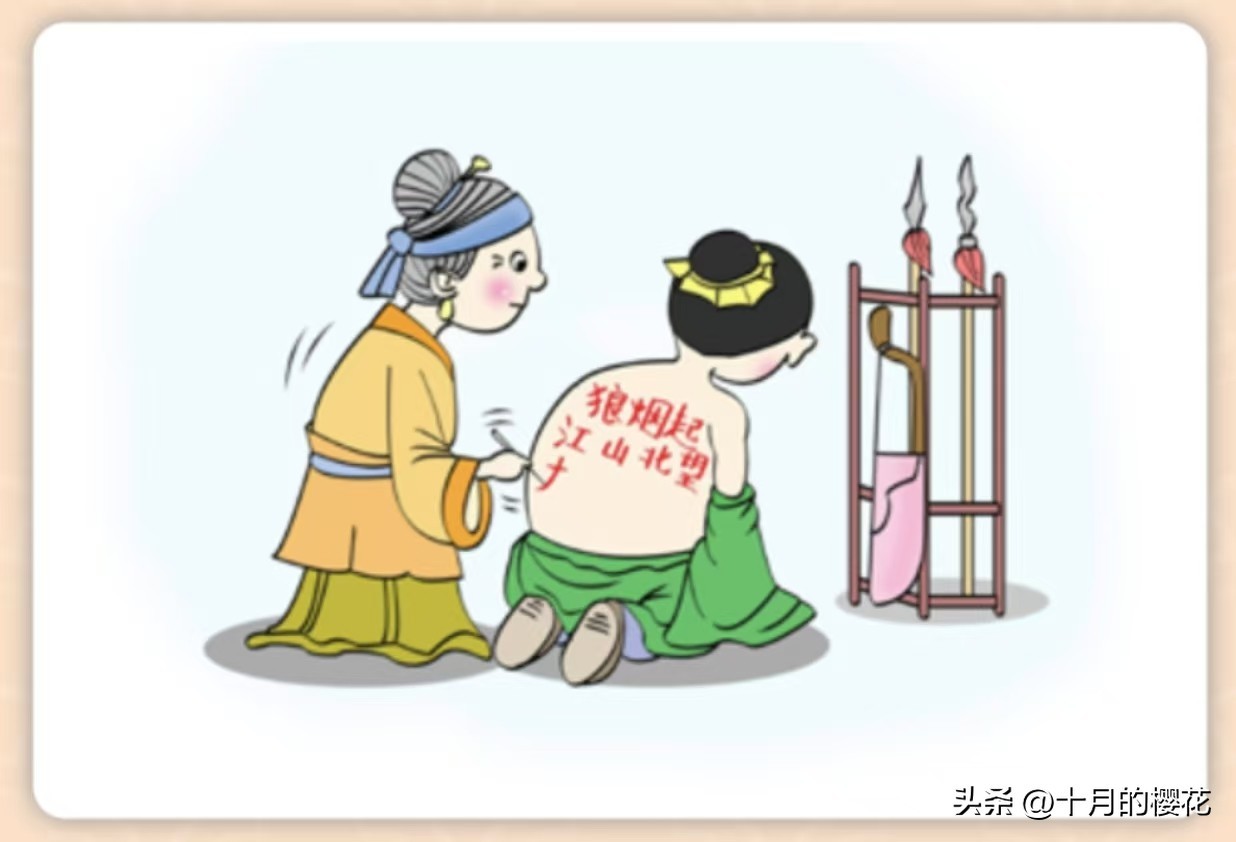 【图 意】:一位老母亲拿着针给儿子后背刺字,所刺的字出自一首气势恢宏的爱国歌曲。