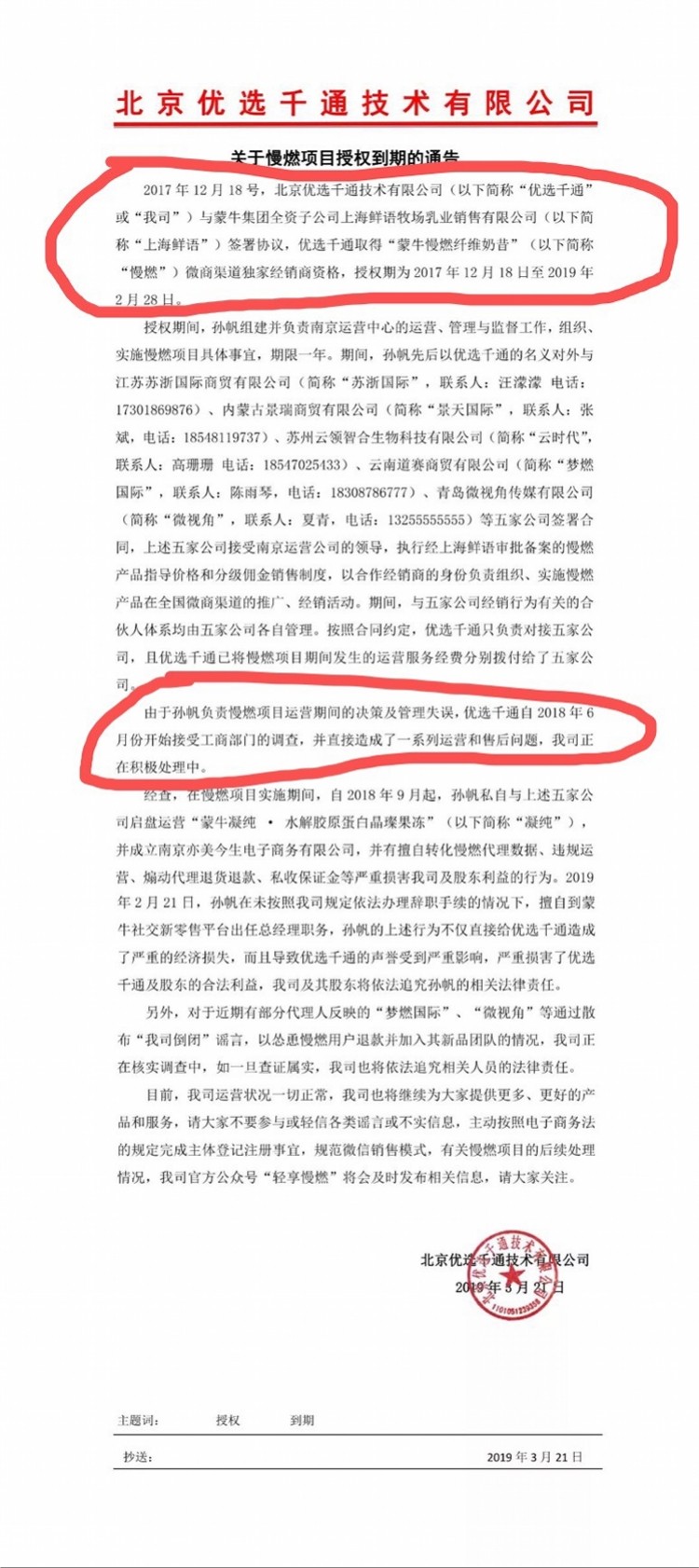 公告称公司在2017 年12 月18 日与蒙牛全资子公司上海鲜语牧场乳业销售有限公司签署协议,取得慢燃纤维奶昔的微商渠道独家经销商资格,授权期到2019年2 月28 日。该通告还将矛头指向公司前南京运营中心负责人、据称是现蒙牛社交新零售平台总经理的孙帆,称“由于孙帆负责慢燃项目期间的决策及管理失误,导致优选千通自2018年6月开始接受工商部门调查,并造成一系列运营和售后问题”。