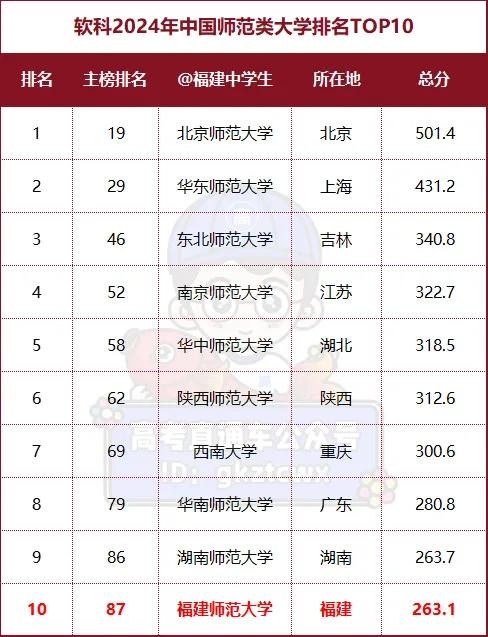 值得注意的是,福建师范大学在本次排名中以总分263.1位列第十,这不仅是对福建师范大学教育质量和办学水平的肯定,也为福建省的师范教育增添了光彩。对于福建的学生而言,福建师范大学无疑是一个值得关注和考虑的优秀选择。