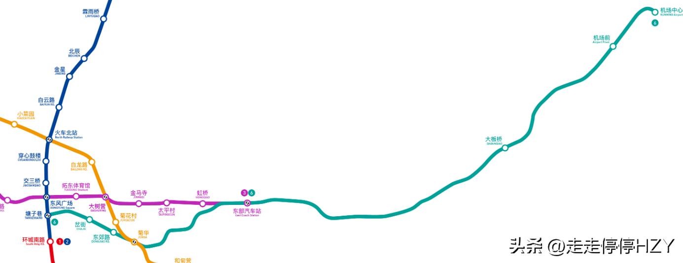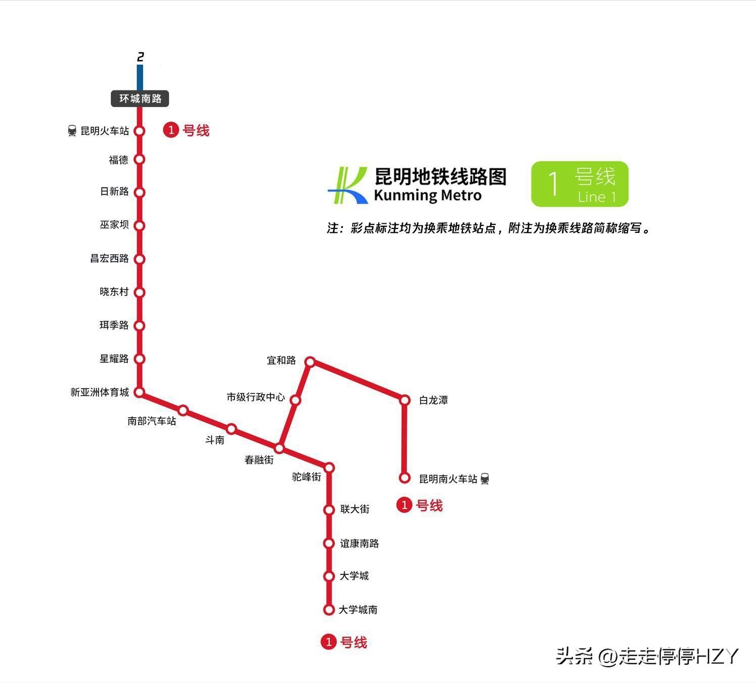 地铁2号线:起点为北部汽车站,终点为环城南路站,全长12.3公里,共设14个车站。是昆明北部与主城区的地铁主干线,解决主城南北客运主流向出行需求的南北主轴线,2号线也是昆明目前在运营线路最短的一条。