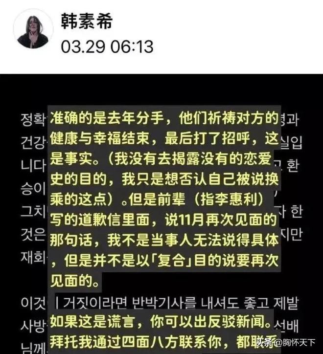 两周前,韩素希与柳俊烈的恋情曝光一度占据各大娱乐版头条,然而甜蜜热度尚未散去,突如其来的分手消息令外界瞠目。韩素希在声明中坦承,恋情公开后的处理方式有误,为此向公众致歉并愿意接受批评。知情人士透露,两人在公开恋情后不久即遭遇一系列沟通矛盾,尽管尝试调解,但最终未能达成共识,决定各自前行。