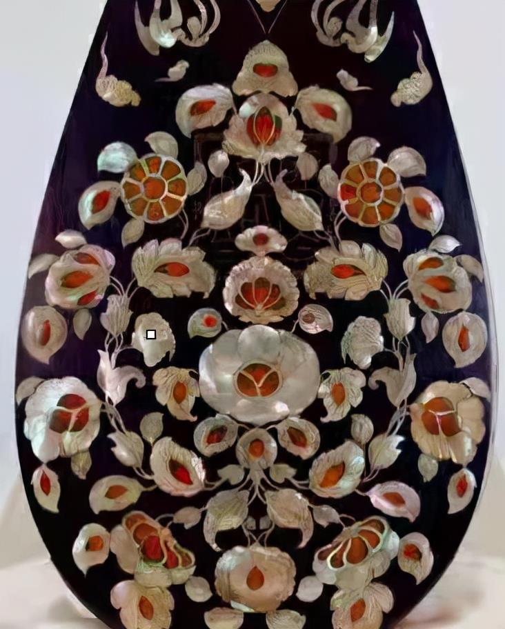 更让人拍案叫绝的,是这把琵琶背面,在黑色的,镶嵌着无数的螺钿玳瑁夜光贝壳,每个贝壳上都雕刻着精巧花纹,有的贝壳上还涂着淡淡的金色,整个图案豪华绚烂,美轮美奂,富贵逼人。