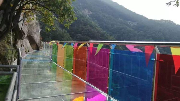 五彩玻璃栈道总长度148米,最大落差290米,位于白龙瀑旁,从下往上看,就像一道美丽的彩虹,简直刺激又好看。