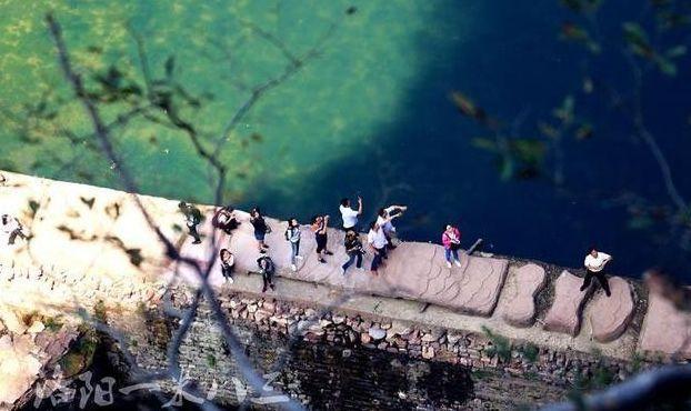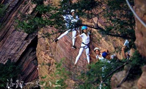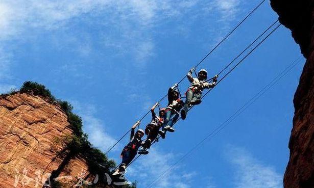 除了上面的玻璃栈道,还有更刺激的,青要山飞拉达绝壁天路,不仅有徒手攀爬的千米崖壁,还要走钢丝,很多人笑着上去,最后哭着爬下来。