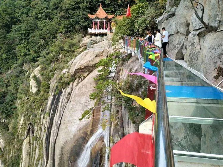 黛眉山5D玻璃栈道镶在数百米的山腰,全场4百余米,号称是中原地区最长的玻璃栈道,站到玻璃栈道上,莫名的觉得腿软腰酸,仿佛没有实地踩起来更让我们踏实,有胆量你可以来试试,当然了,你如果是被小伙伴强拉来的,请扶好墙根走哦~