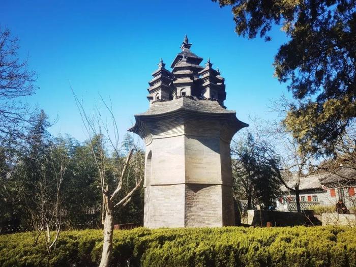 缎华泉北就是九顶塔,建于唐代,是全国重点文物保护单位。九顶塔塔高13.36米,是一座单层砖塔,塔心为实体。八角塔檐的每个角之上各筑三层叠涩挑檐方形小塔,围绕中心同样造型的主塔。平视塔顶,九塔棱角分明,气象森严。从高处俯瞰,九塔如九个花朵,美丽有序,卓然特立。