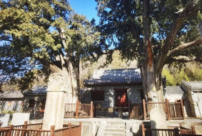 九顶塔旁,观音殿前,有两株高大的千年古柏,相传是由唐朝大将军尉迟敬德亲手栽种的,名曰“茶柏”和“烟柏”,它们像卫士一样站岗守护。“山得水而壮,水得山而媚”,九顶塔的大瀑布一改往日跌宕磅礴的气势,慢慢溅水成冰,在岩石上形成了层层叠叠的冰挂,冰水交融甚是壮观。