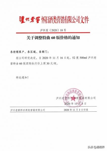 1月3日,笔者从市场获悉,泸州老窖怀旧酒类营销有限公司发布《关于调整特曲60版价格的通知》的文件。文件显示:经公司研究决定,自2025年11月16日起,52度500ml泸州老窖特曲60版团购执行价上调30元每瓶。