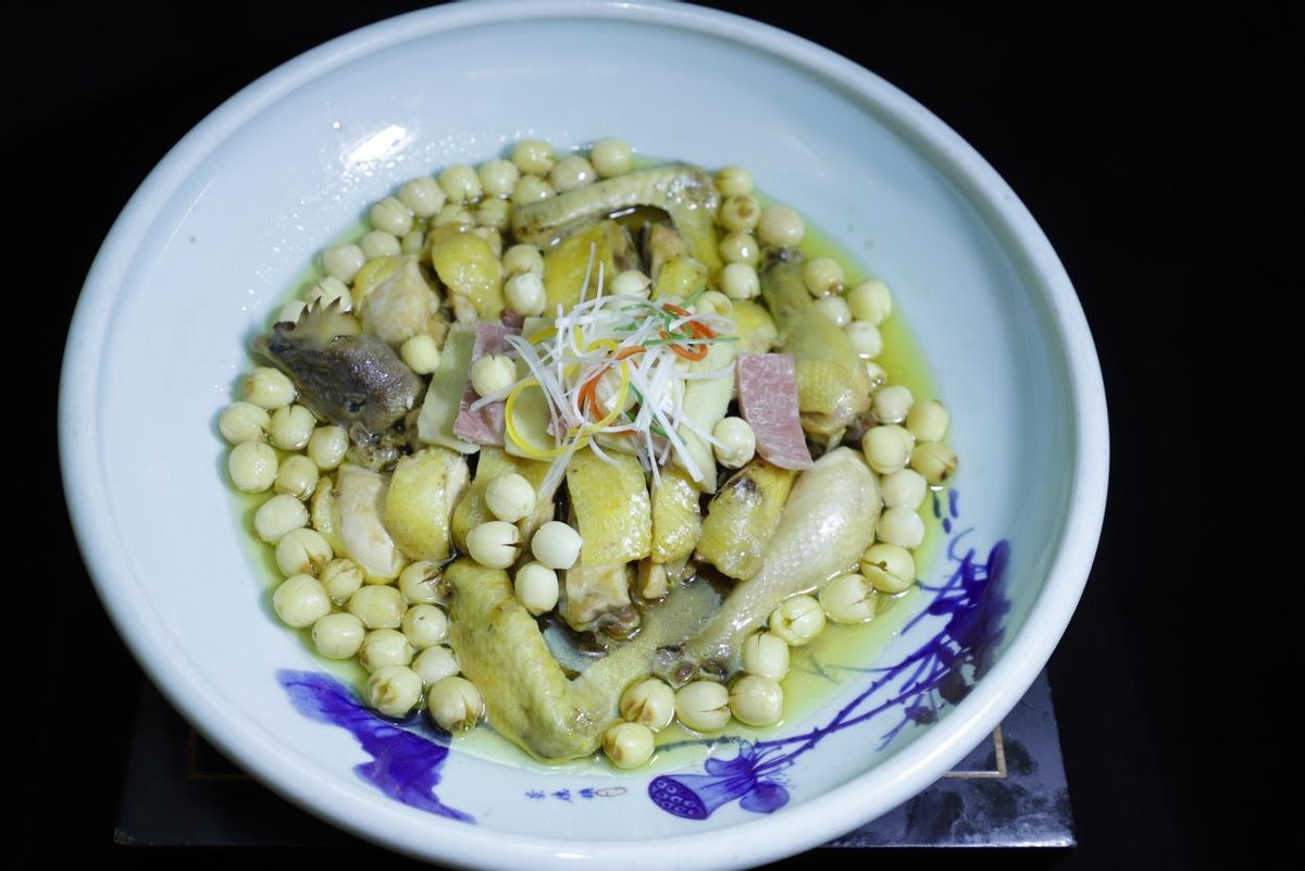 是以里叶白莲的莲子和浙江本地的散养鸡为主材,辅以姜片、盐、绍酒为辅材制作而成。