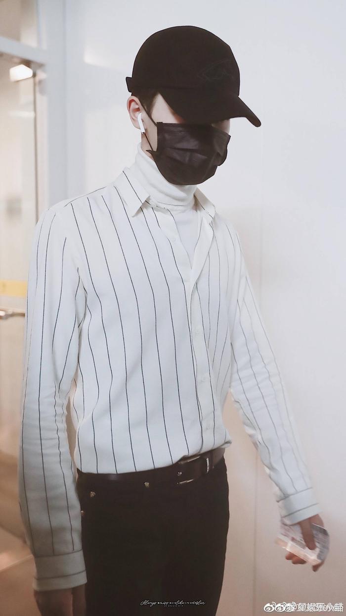 朱正廷机场出发✈️南京 一身白色条纹衬衫+白色高领毛衣+黑长裤的仙
